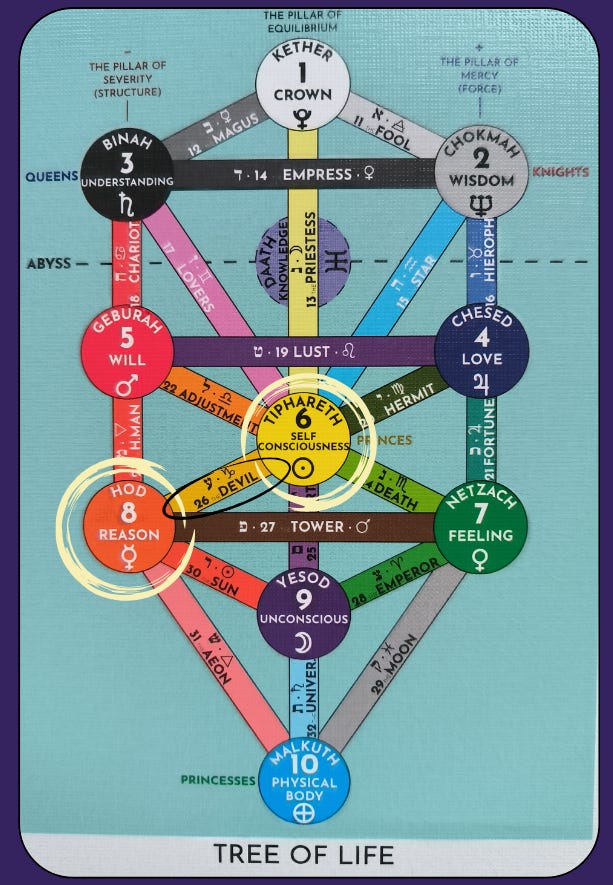 I will throw a little bit of esoteric teachings related to this card that you can explore on your own. :-) In Quabalah, the title of this card is “The Lord of the Gates of Matter. The child of the forces of time”. Hebrew letter “ayin” is associated to this card meaning “eye”. (the eye of good & the eye of evil, third eye...which eye is the question? :-) “. On the Tree of Life, the Devil card is associated to the path that connects Tipharet (heart) and Hod (abstract thought). According to some authors “his path concerns our choice: to see illusions, or to see past illusion to the true nature of reality”. Something to ponder about.